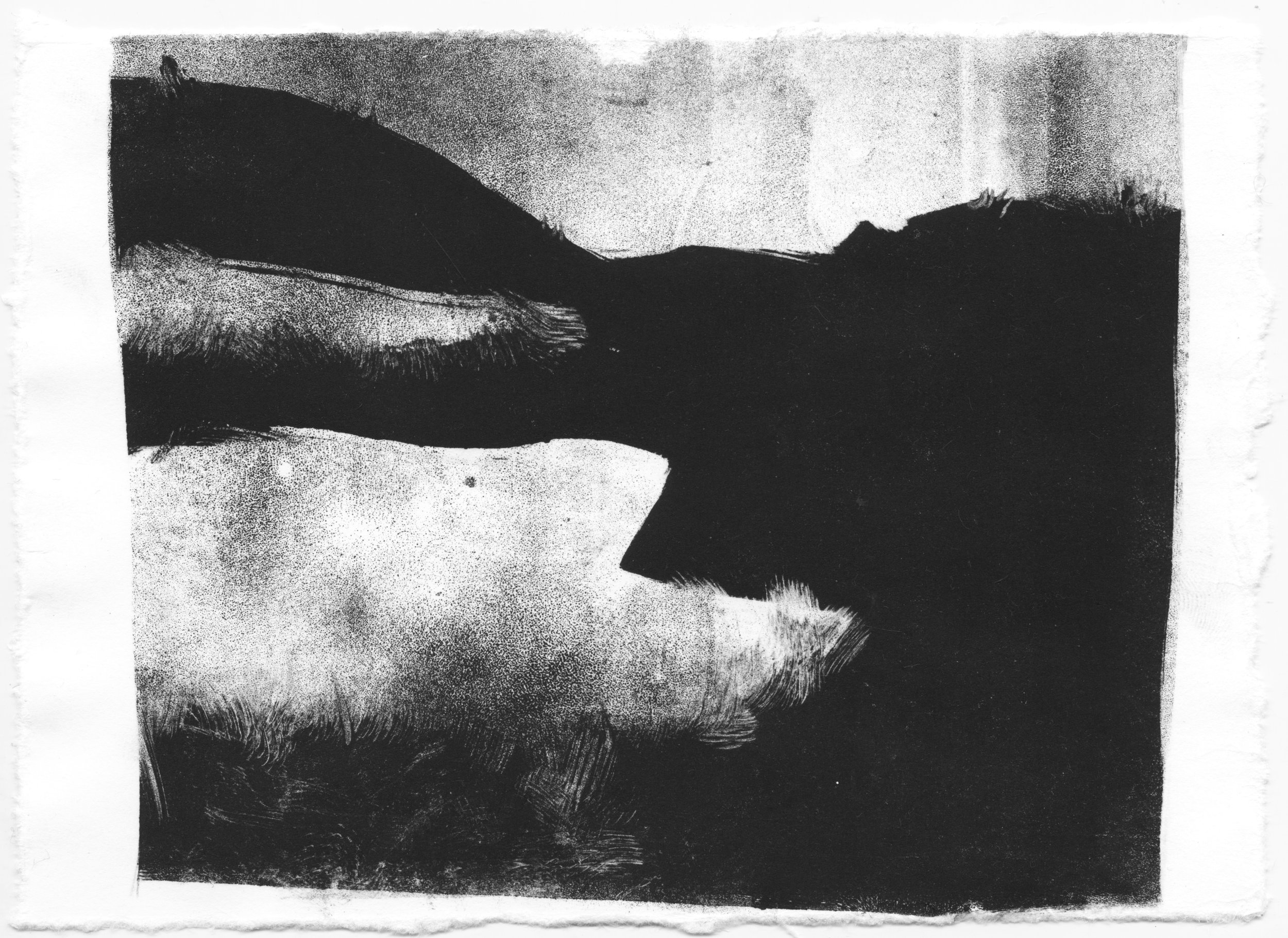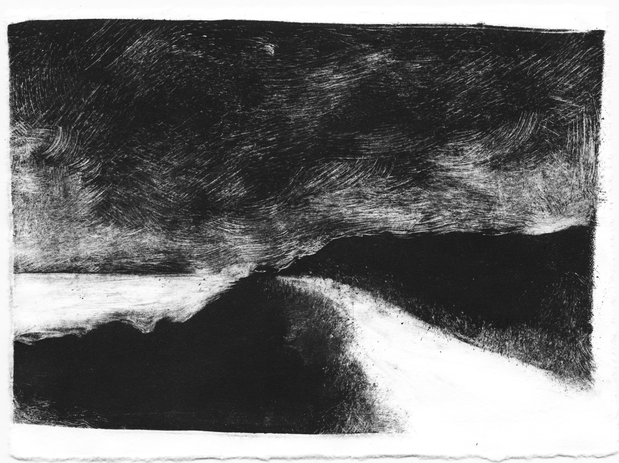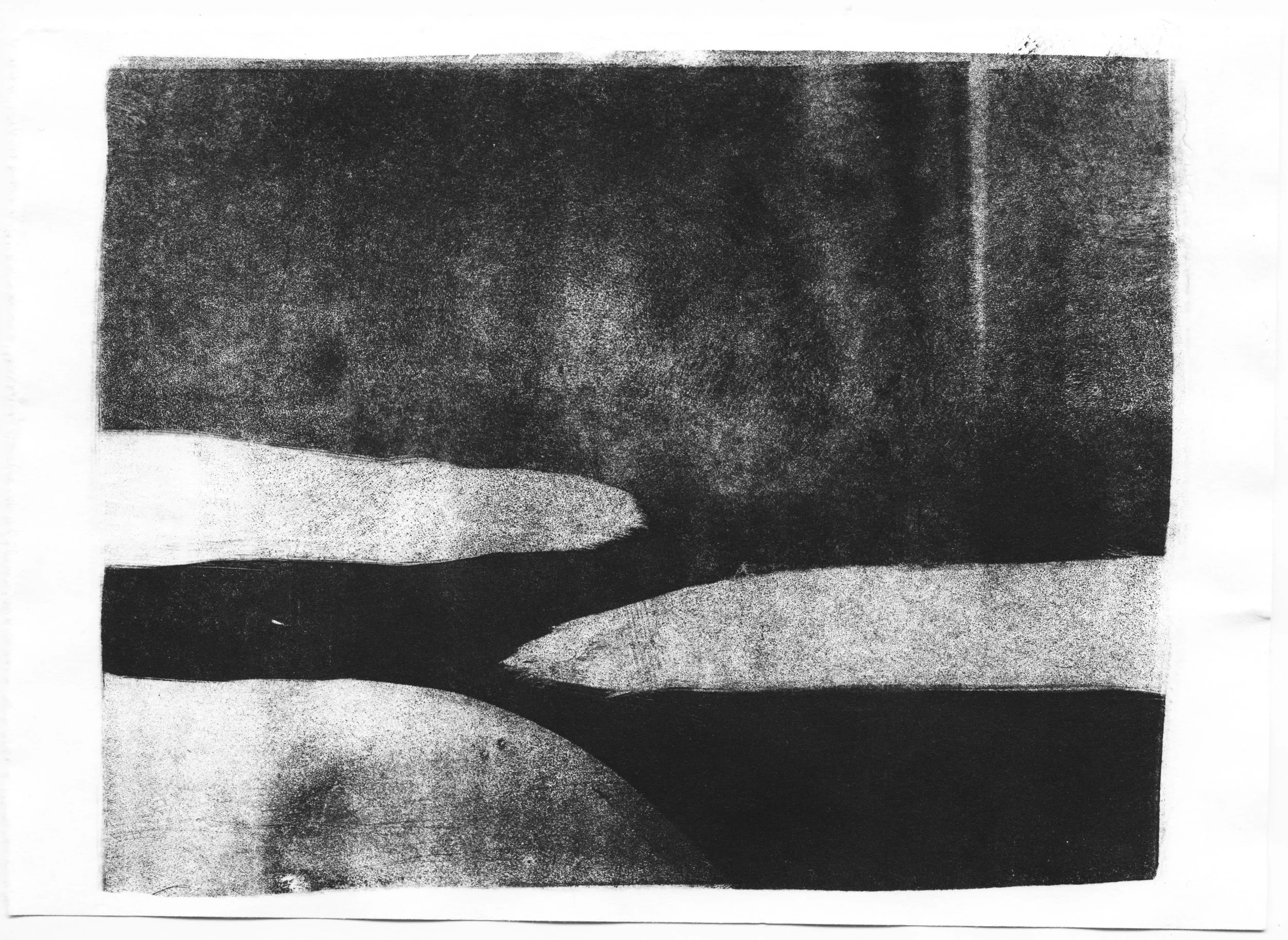 Cette série de monotypes naît d’une découverte de la technique du monotype à l’atelier de gravure, une impression produisant une image unique. À partir de ce procédé, je développe une recherche autour du paysage et de la notion d’étendue.