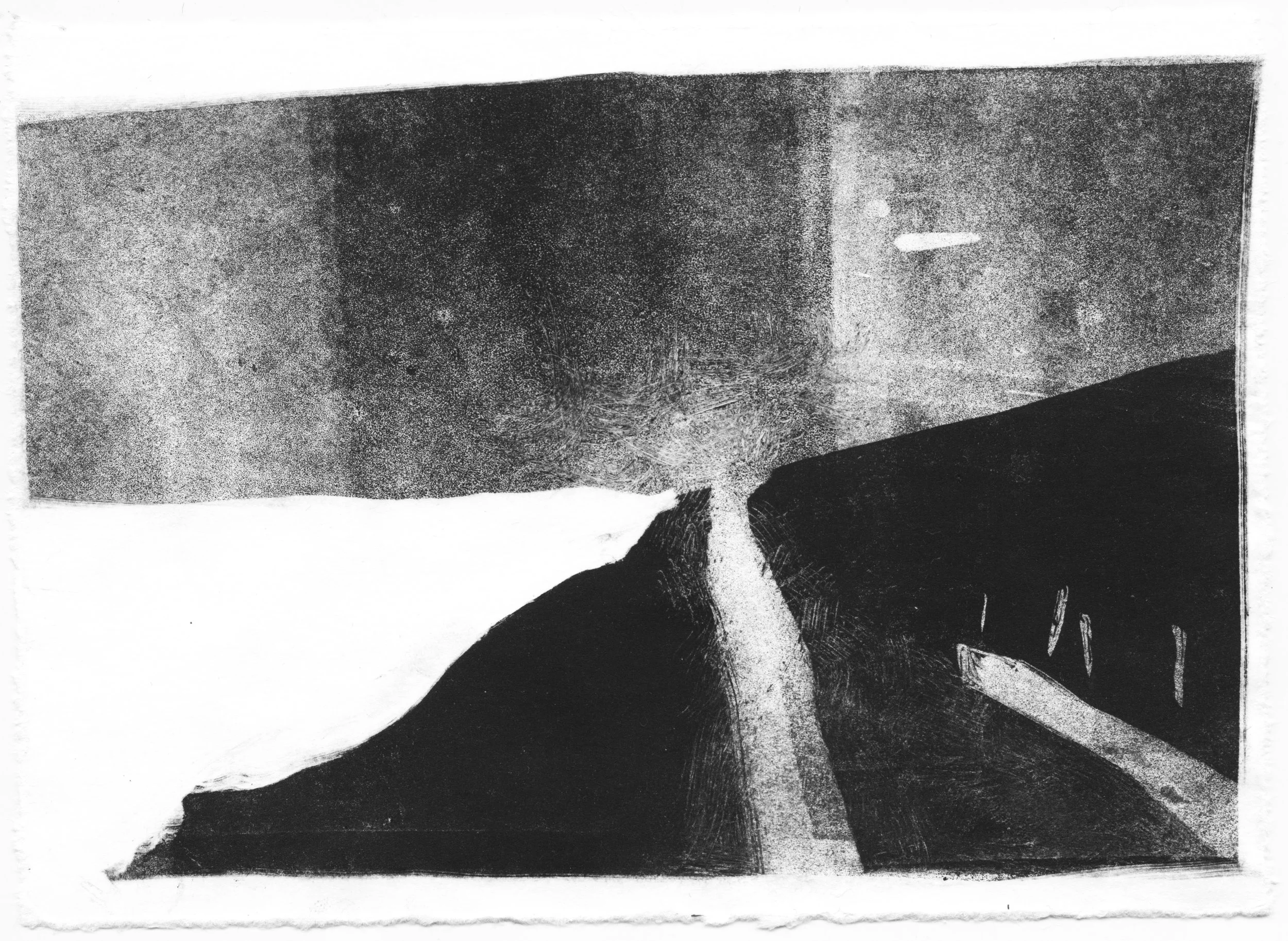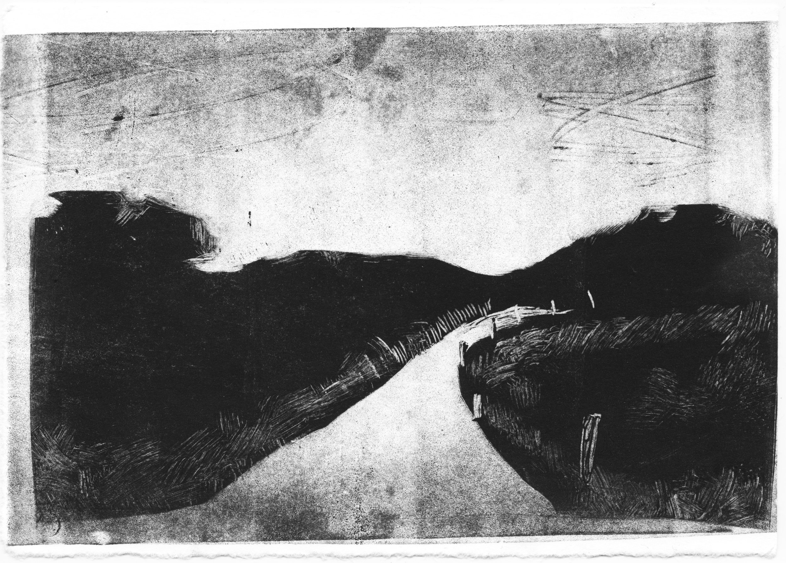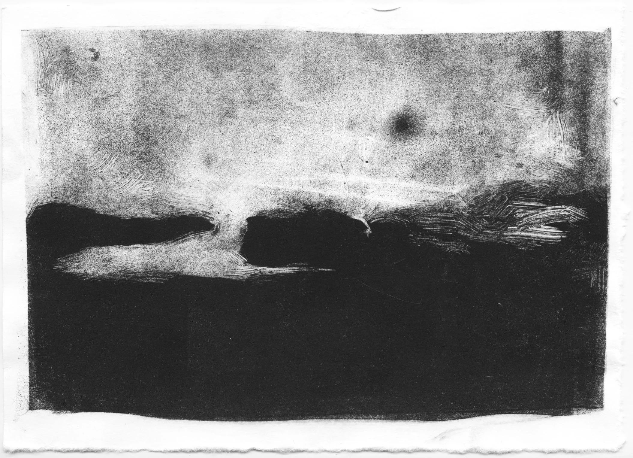Cette série de monotypes naît d’une découverte de la technique du monotype à l’atelier de gravure, une impression produisant une image unique. À partir de ce procédé, je développe une recherche autour du paysage et de la notion d’étendue.
